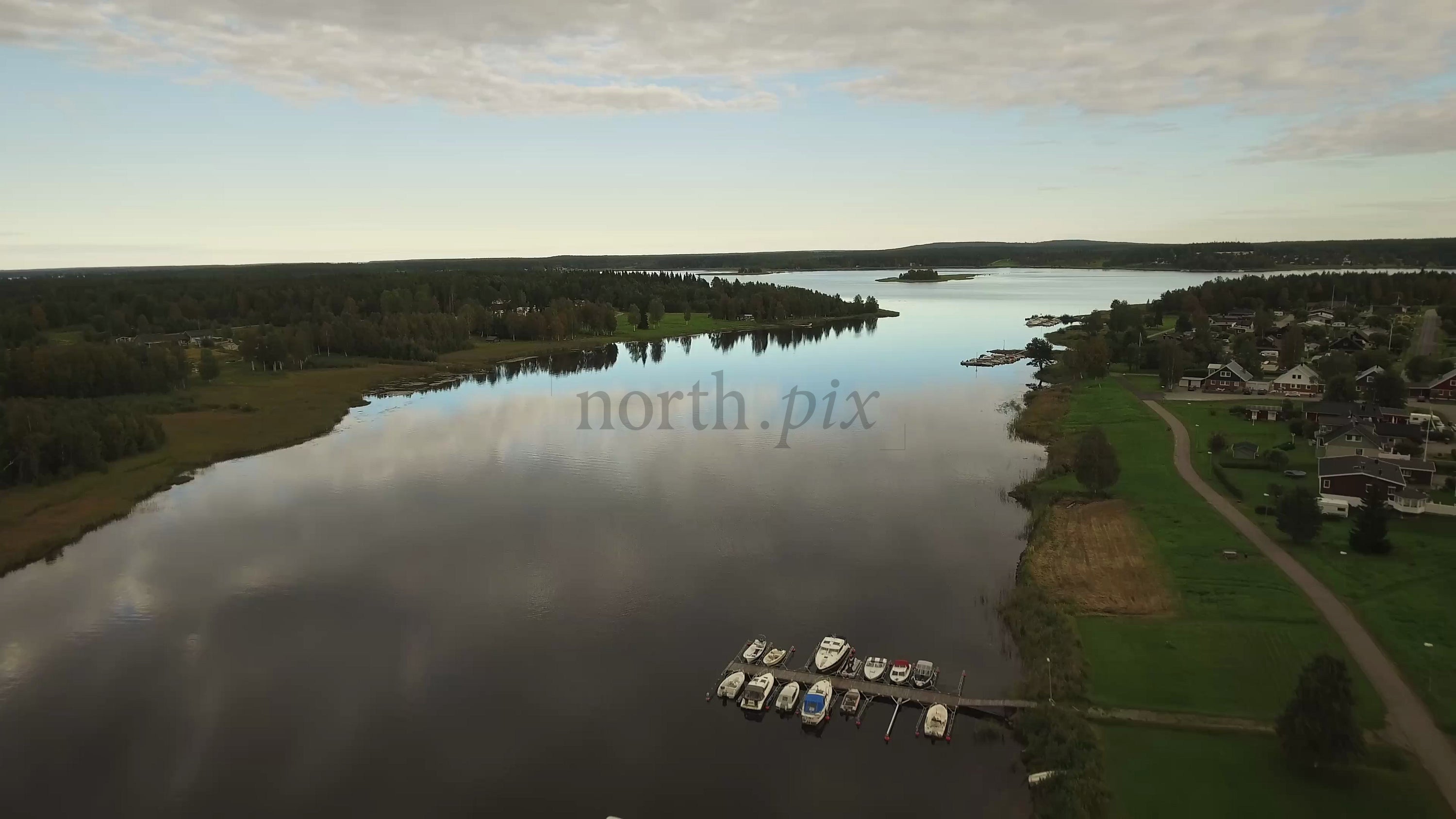 A breathtaking aerial perspective reveals the tranquil beauty of Fårön Island in the Piteå Archipelago. The calm waters reflect the sky, surrounded by lush forests and charming shoreline homes, with a peaceful marina nearby.