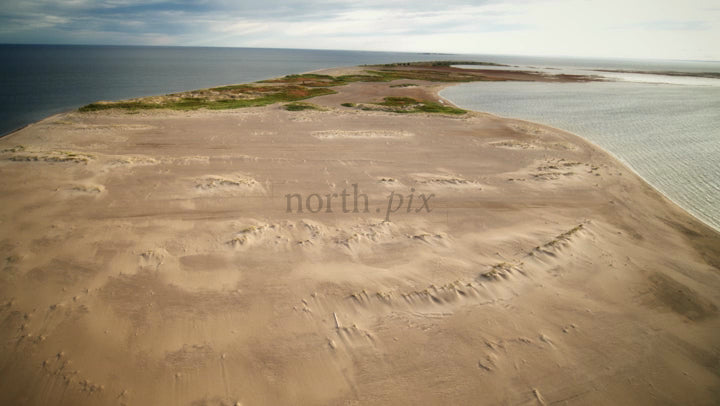 Drone shot of the Skvalpen Archipelago in Lulea, Sweden during a bright summer day. The wide shot showcases the sandy beach, shallow waters, and green vegetation.