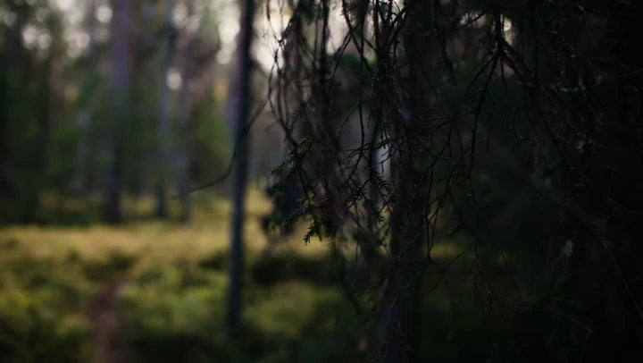 Two hikers walk through a boreal forest in Luleå, Sweden, during the autumn. The handheld camera shot emphasizes the tranquility and natural beauty of the Nordic landscape.