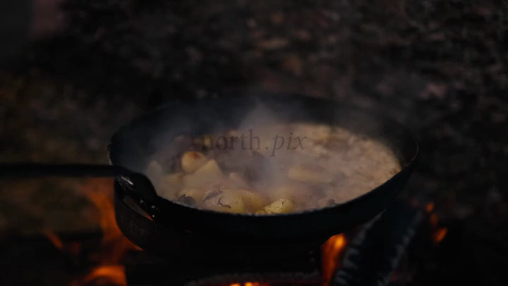 Cooking meat and potatoes in a pan over an open fire in the winter. The steam rises as the ingredients are tossed.
