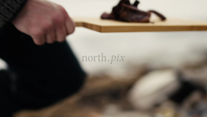 Close-up: Cooking moose meat and potatoes in a pan over a campfire in the Luleå archipelago during winter. Daytime, handheld shot.