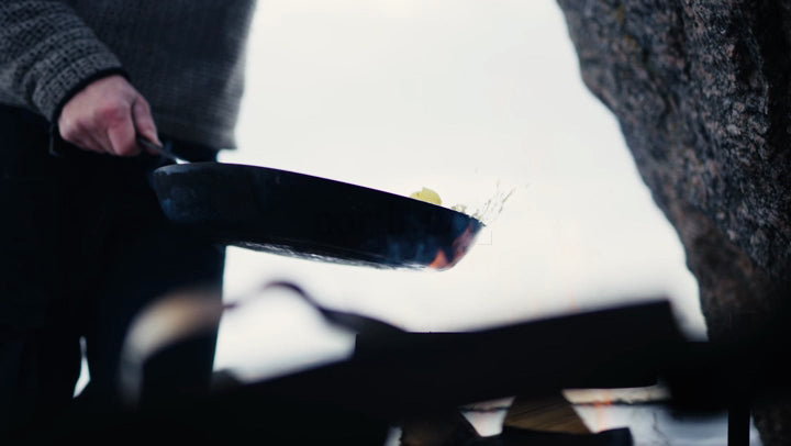 A person flips potatoes in a pan over a fire in a snowy winter landscape near Luleå, Sweden. Daytime, handheld shot.