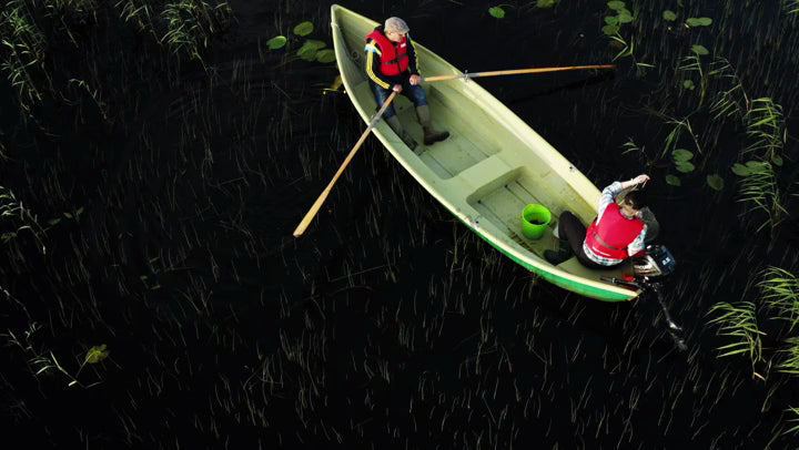 Two people in a small boat prepare crayfish traps on a calm lake in Luleå, Sweden during a bright summer day. Aerial drone shot.