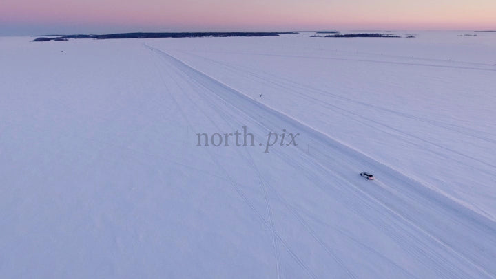 Driving on a Frozen Ice Road at Sunset in the Lulea Archipelago, Sweden