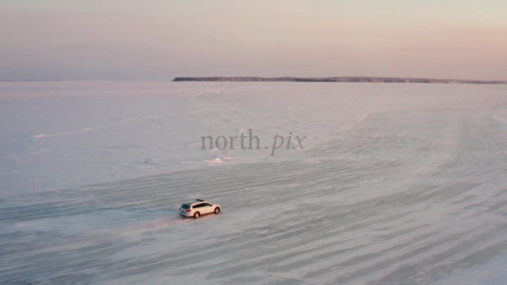 Aerial view of a car driving on a snow-covered ice road in the Luleå archipelago during a winter sunset.