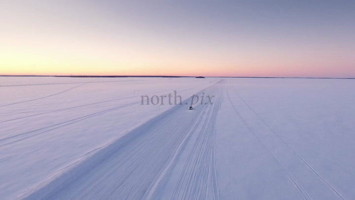 Driving on a Frozen Ice Road in the Lulea Archipelago at Sunset During Winter