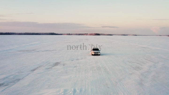 Driving on Frozen Ice Road in Luleå Archipelago at Sunset