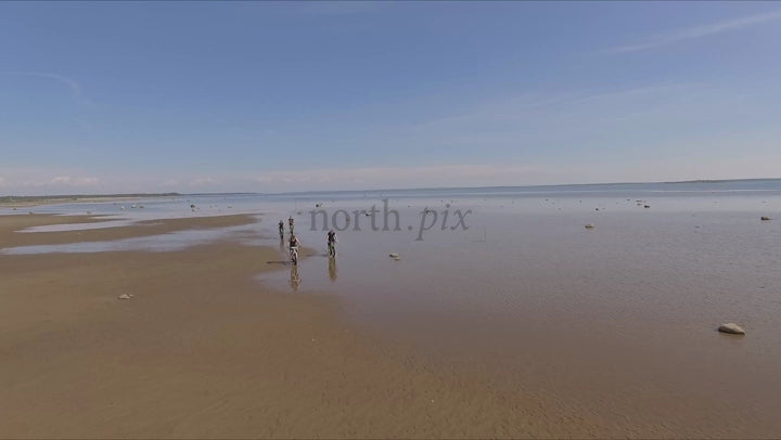 Group of people fat biking on the beach in the Sandön Archipelago, Luleå, Sweden during a bright summer day.