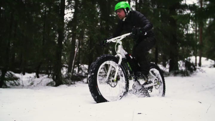 Fatbike Riding in Snowy Forest Trail in Luleå, Sweden, Winter Day