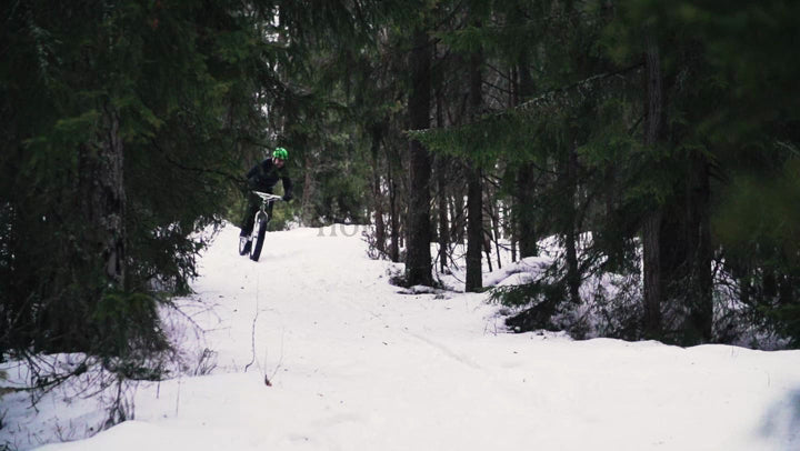 Fatbiking in Winter: Man Rides Snowy Forest Trail in Luleå, Sweden