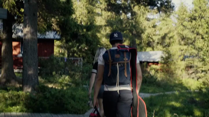 Friends walking through a lush forest on a sunny summer day in Lulea, Sweden. Handheld shot following a small group on a wooden boardwalk.