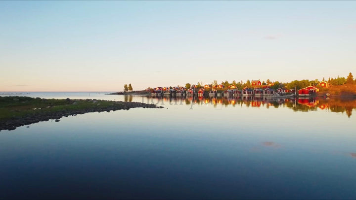 Golden Hour Drone Shot: Red Cabins of the Luleå Archipelago, Sweden