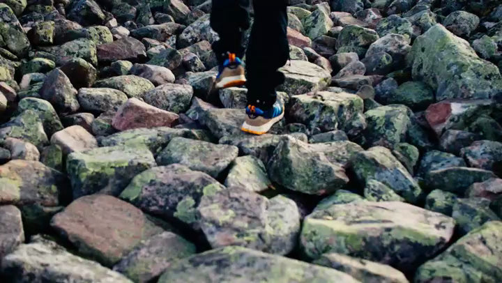 Person Hiking on Rocky Terrain in Luleå, Sweden. Close-up of Hiking Boots Walking. Adventure in the Swedish Outdoors.