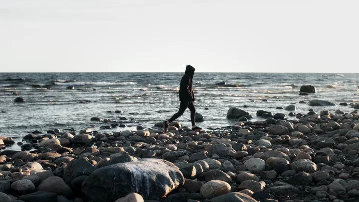A lone person walks along a rocky beach in Luleå, Sweden during a bright summer evening. Handheld wide shot.