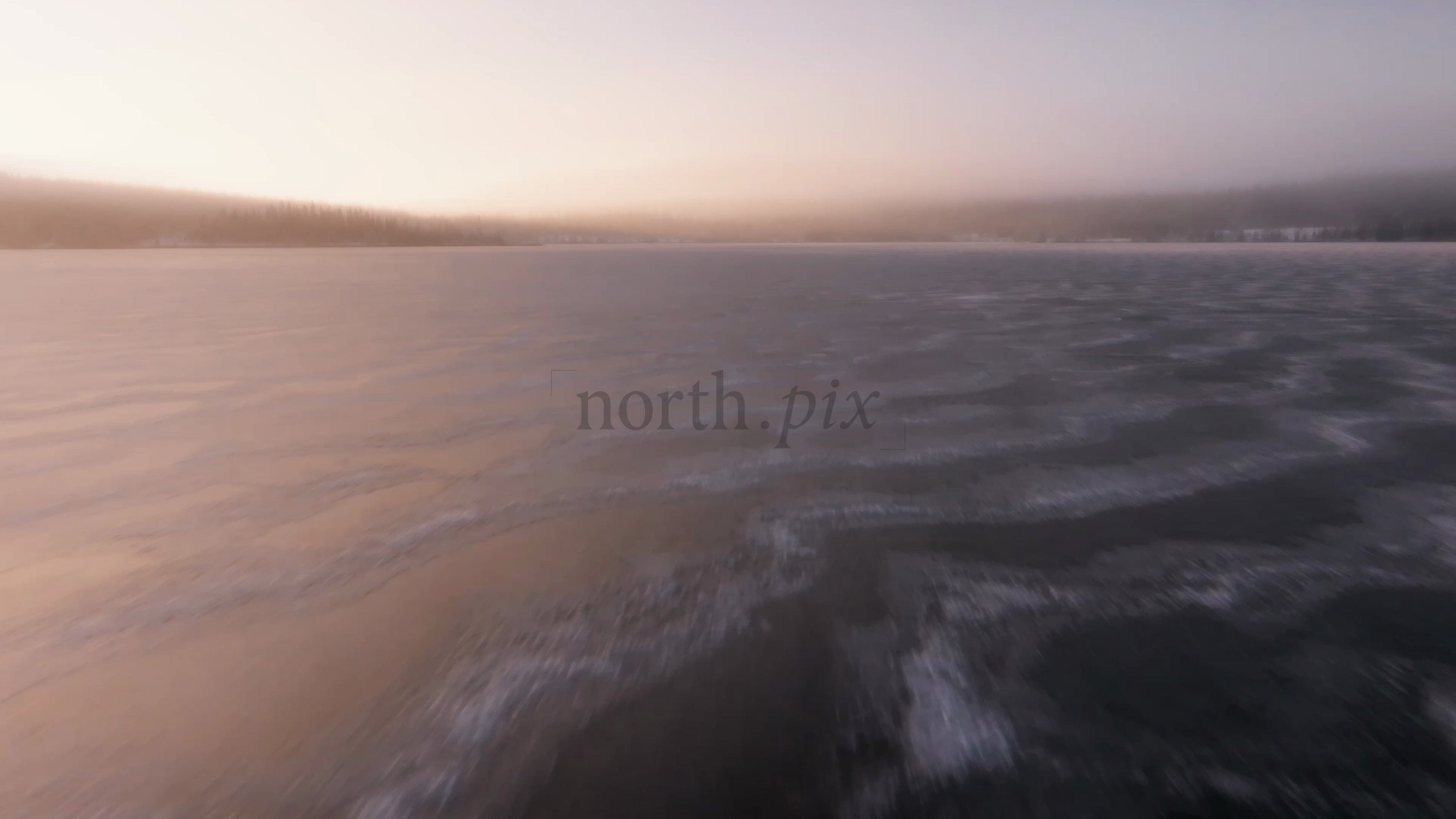 Low-level aerial drone footage over frozen lake during sunset in Arvidsjaur, Sweden. The soft light illuminates the winter landscape with mist and fog.