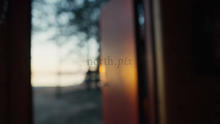 Sunrise over the Luleå Archipelago in Sweden. A handheld shot reveals a tranquil coastal scene from a cabin doorway.