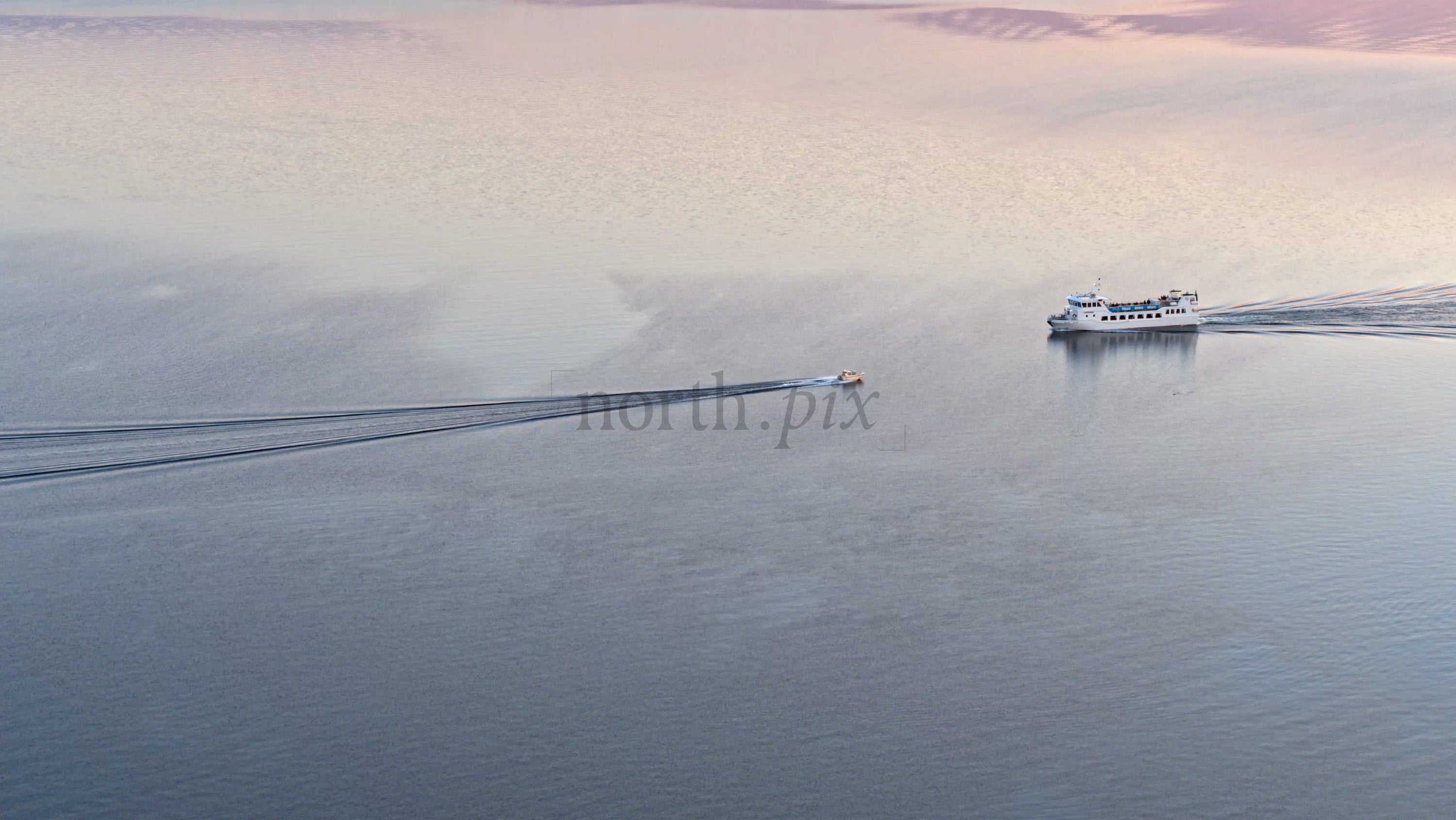 Aerial view of boats sailing on the Lulea River at sunset. The calm water reflects the beautiful sky, creating a serene and peaceful atmosphere. Perfect for travel, nature, or tourism projects.