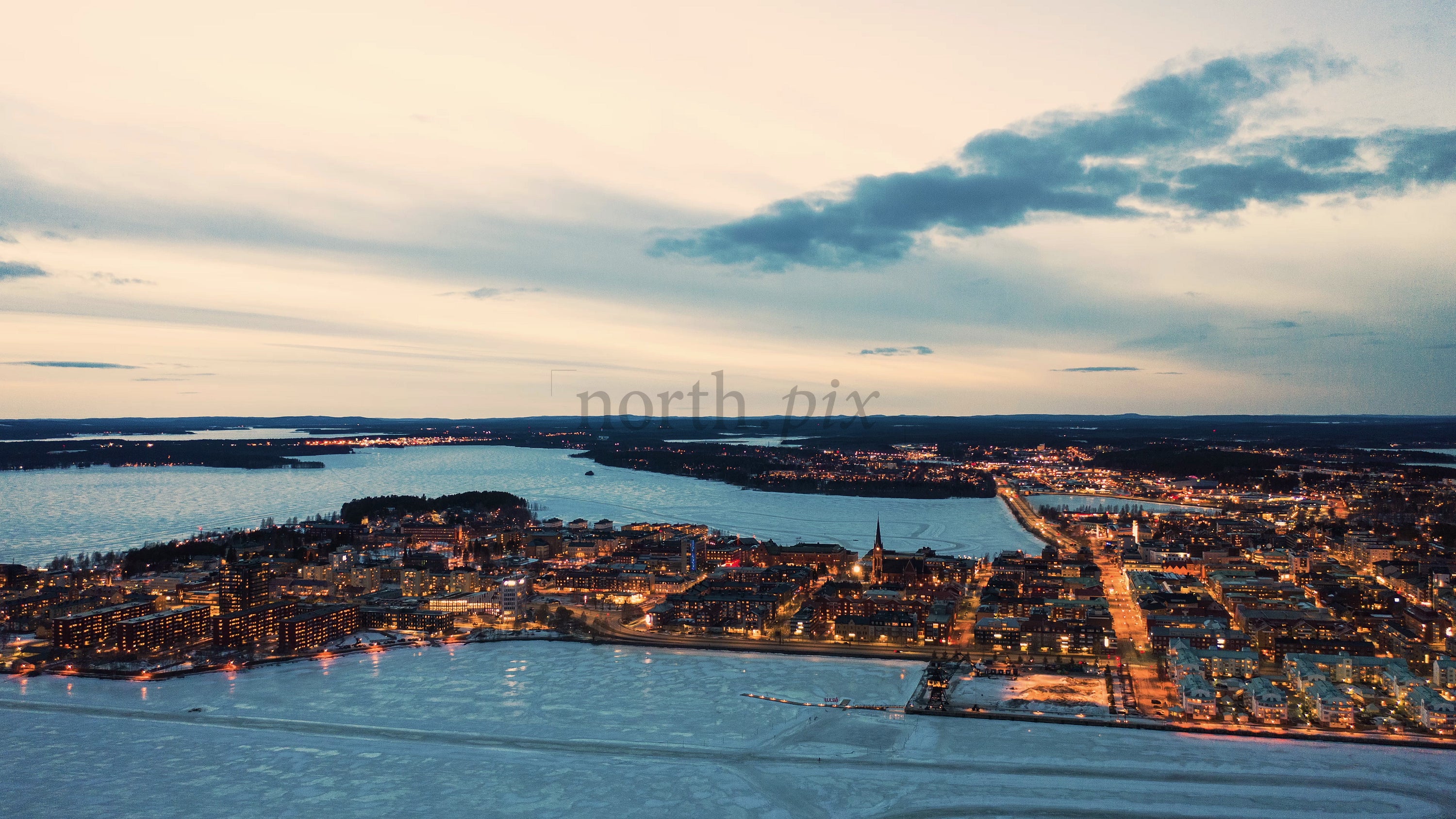 Aerial view of Lulea, Sweden at dusk, with a frozen river and city lights. This winter cityscape features a camera movement and setting sun.