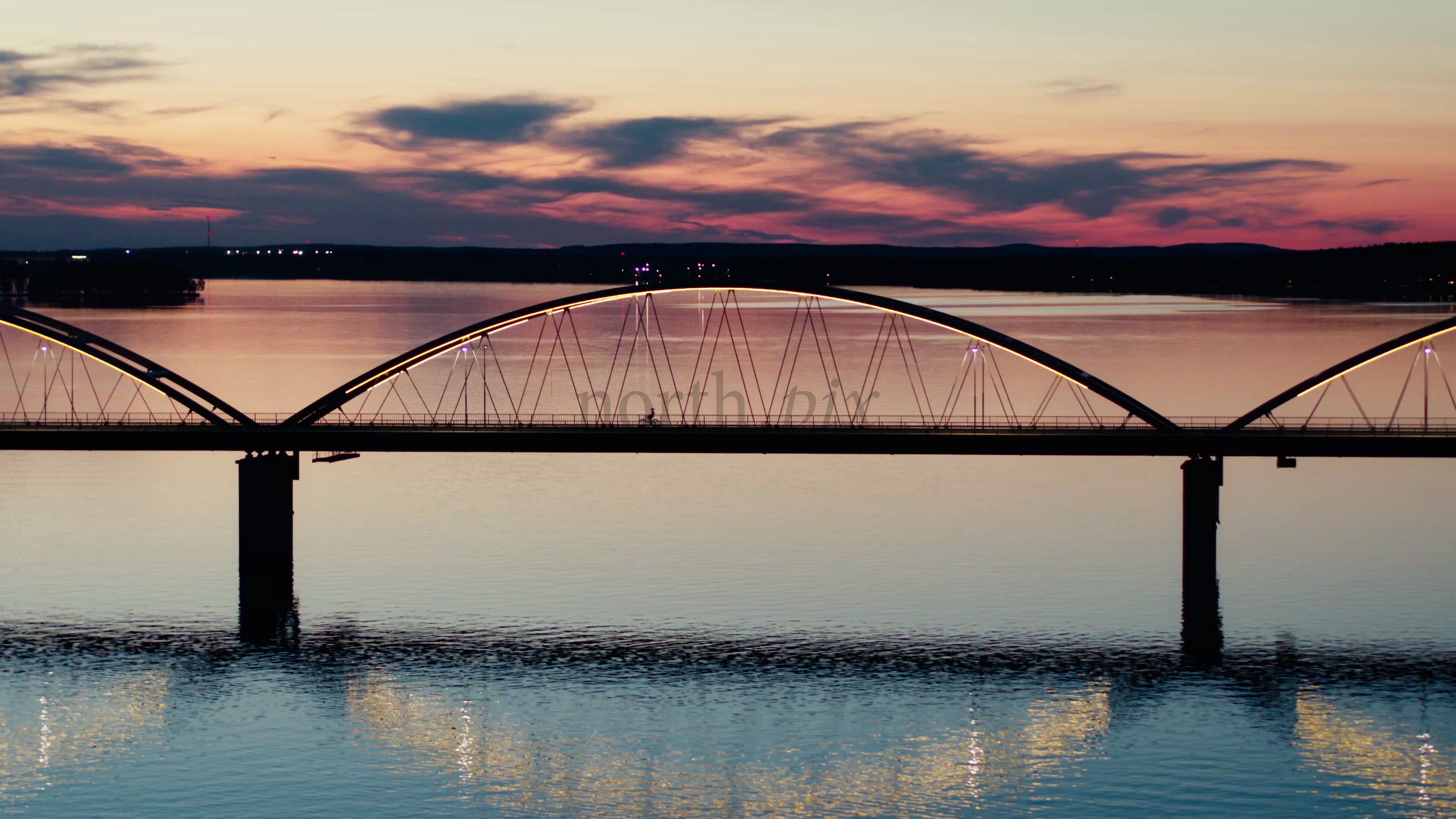Aerial view of the Bergnäsbron bridge in Luleå, Sweden, during a beautiful summer sunset. Cars and bicycles are passing by over the calm water reflecting the colorful sky and bridge lights.