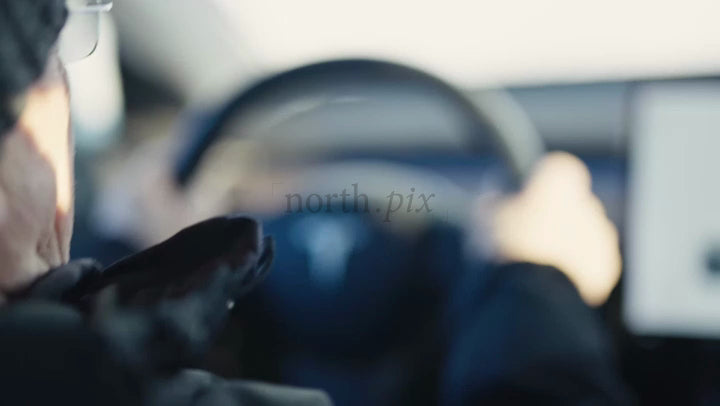 A man drives a Tesla through Luleå, Sweden, on a bright winter day. The shot is taken from over the driver's shoulder, inside the vehicle.