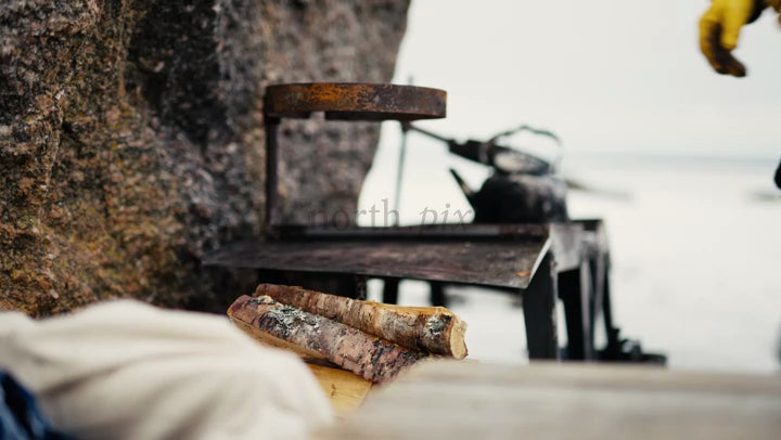 A man prepares a fire in the winter landscape of the Luleå archipelago in Sweden. He carefully places birch logs onto a metal stand, ready for ignition.