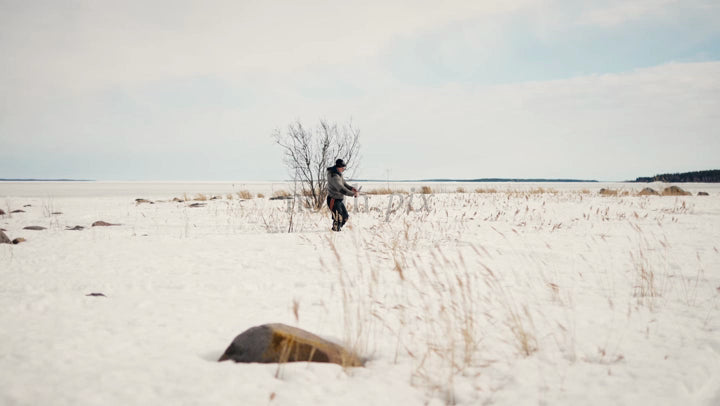 Man Walking Through Snowy Field by Frozen Baltic Sea in Luleå, Sweden