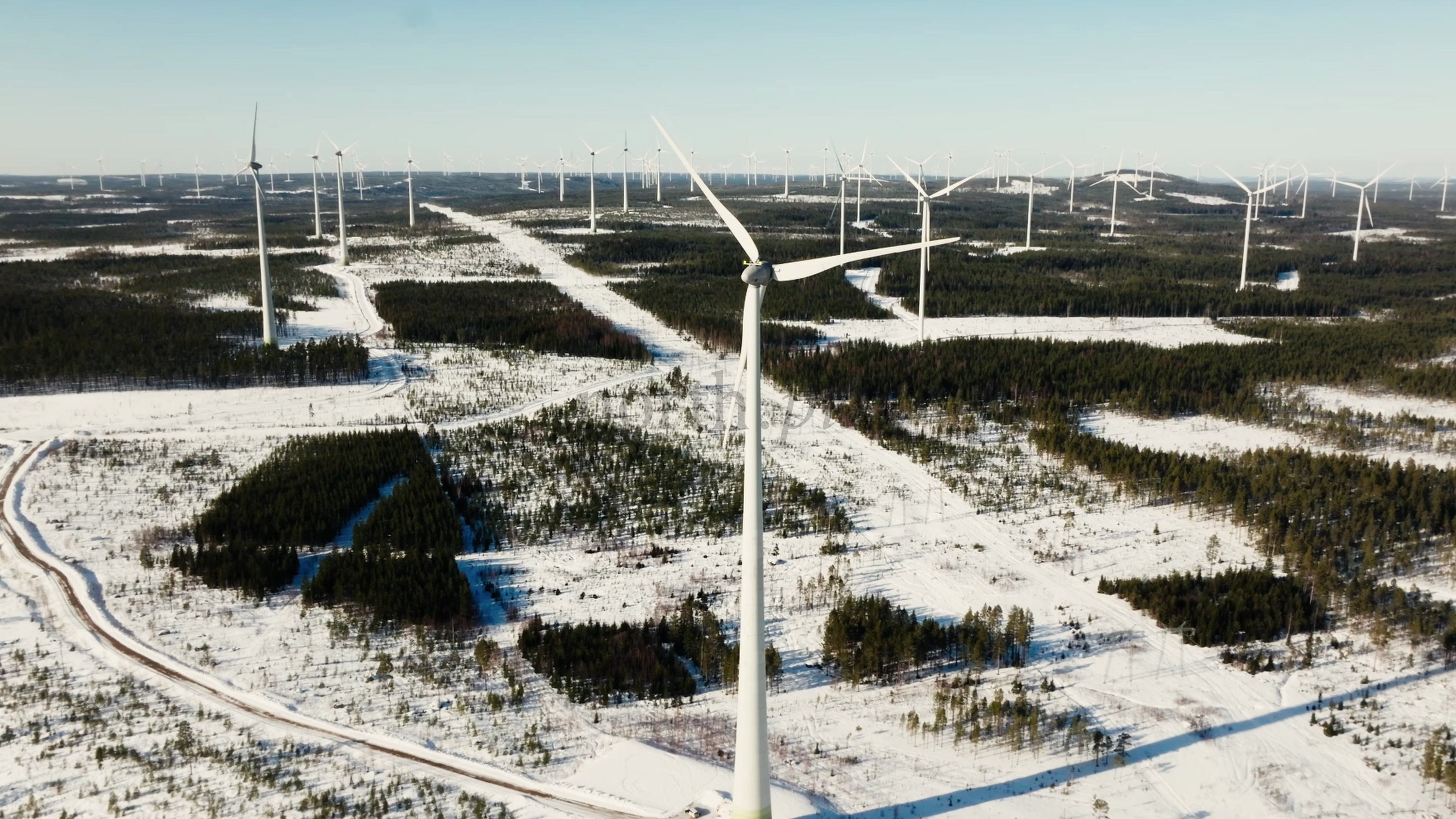 Aerial view of a wind turbine in a snowy winter landscape. Camera moves upwards, revealing the vastness of Markbygden Wind Farm. Renewable energy, sustainability, and environmental protection.
