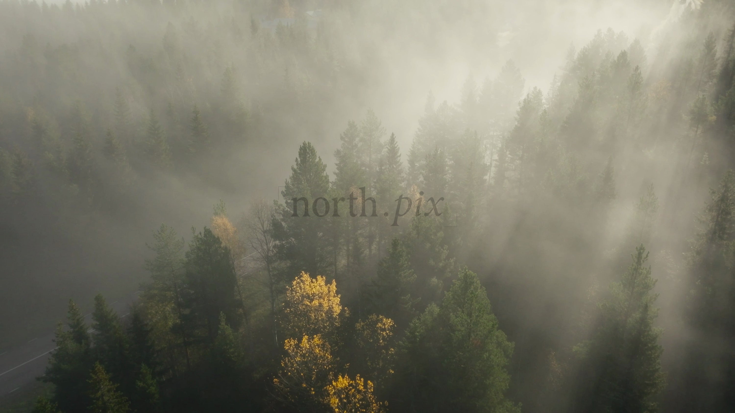 Aerial view of a misty autumn forest with a road and a truck. Foggy, atmospheric, and moody.