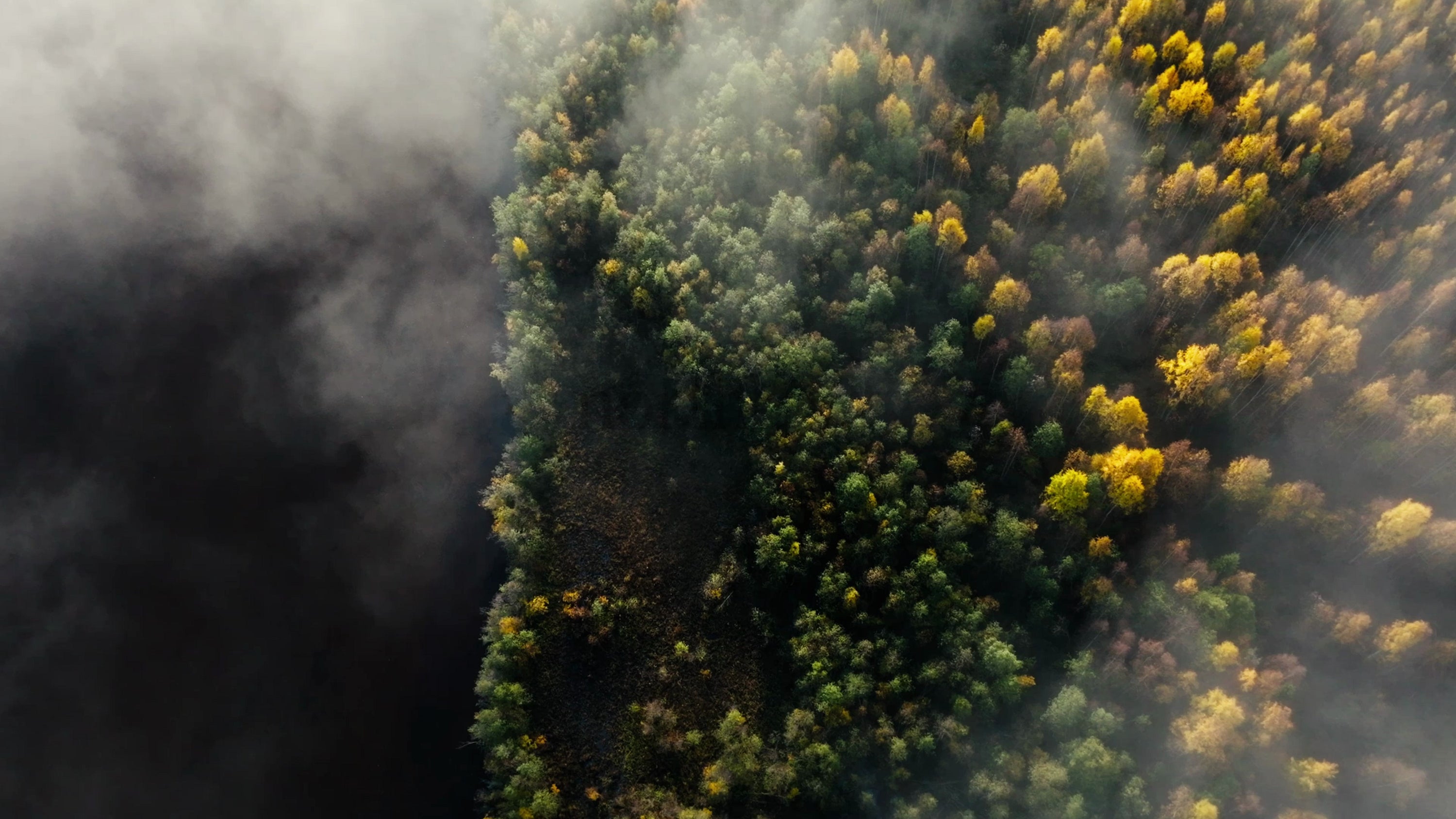 Aerial top down view of misty lake and colorful autumn forest. Dark water with fog contrasting fall foliage trees.