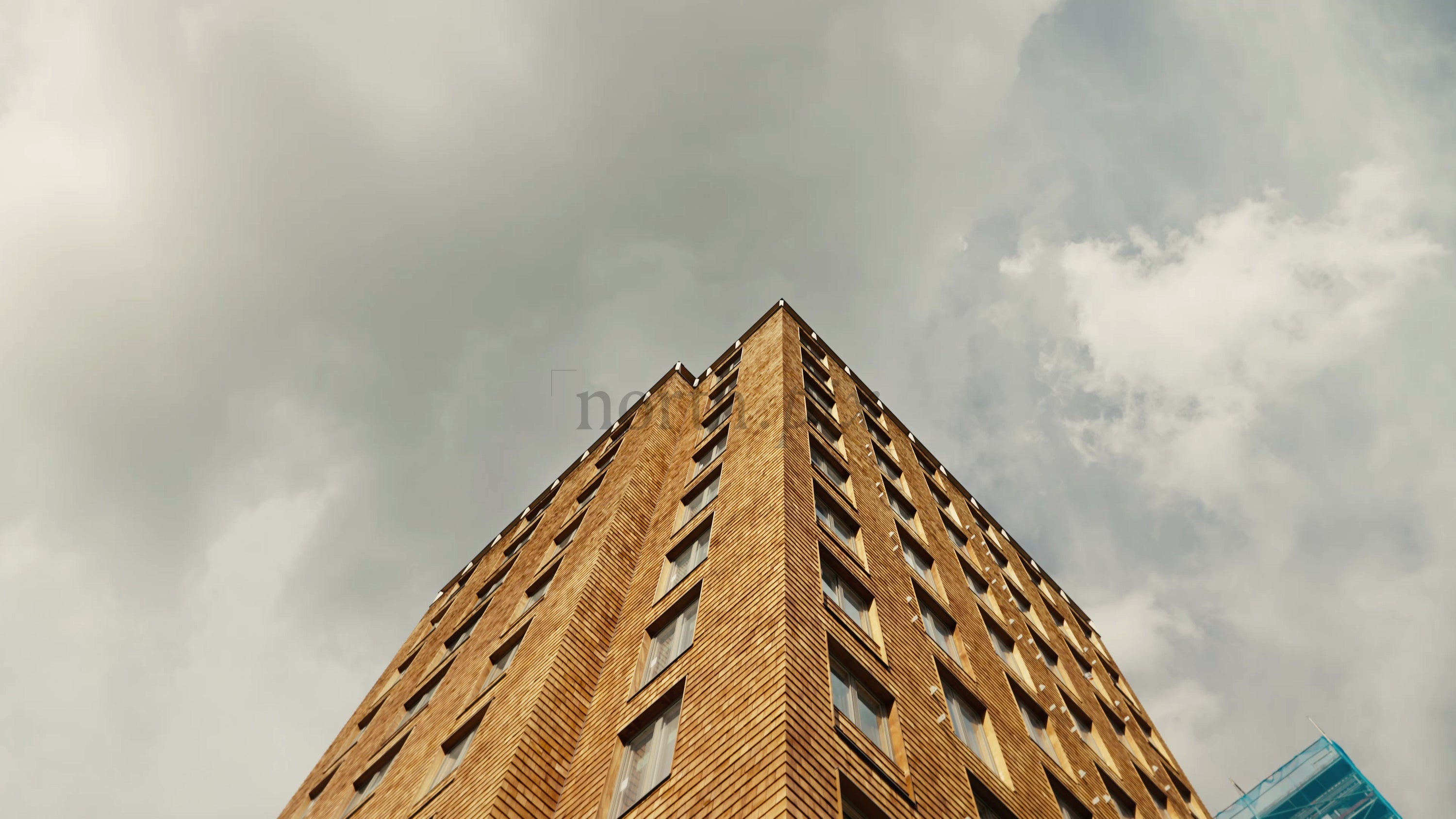 Modern architecture, wood building. Low angle view of wooden building with cloudy sky. Warm, orange-brown colors. Rotating camera movement.