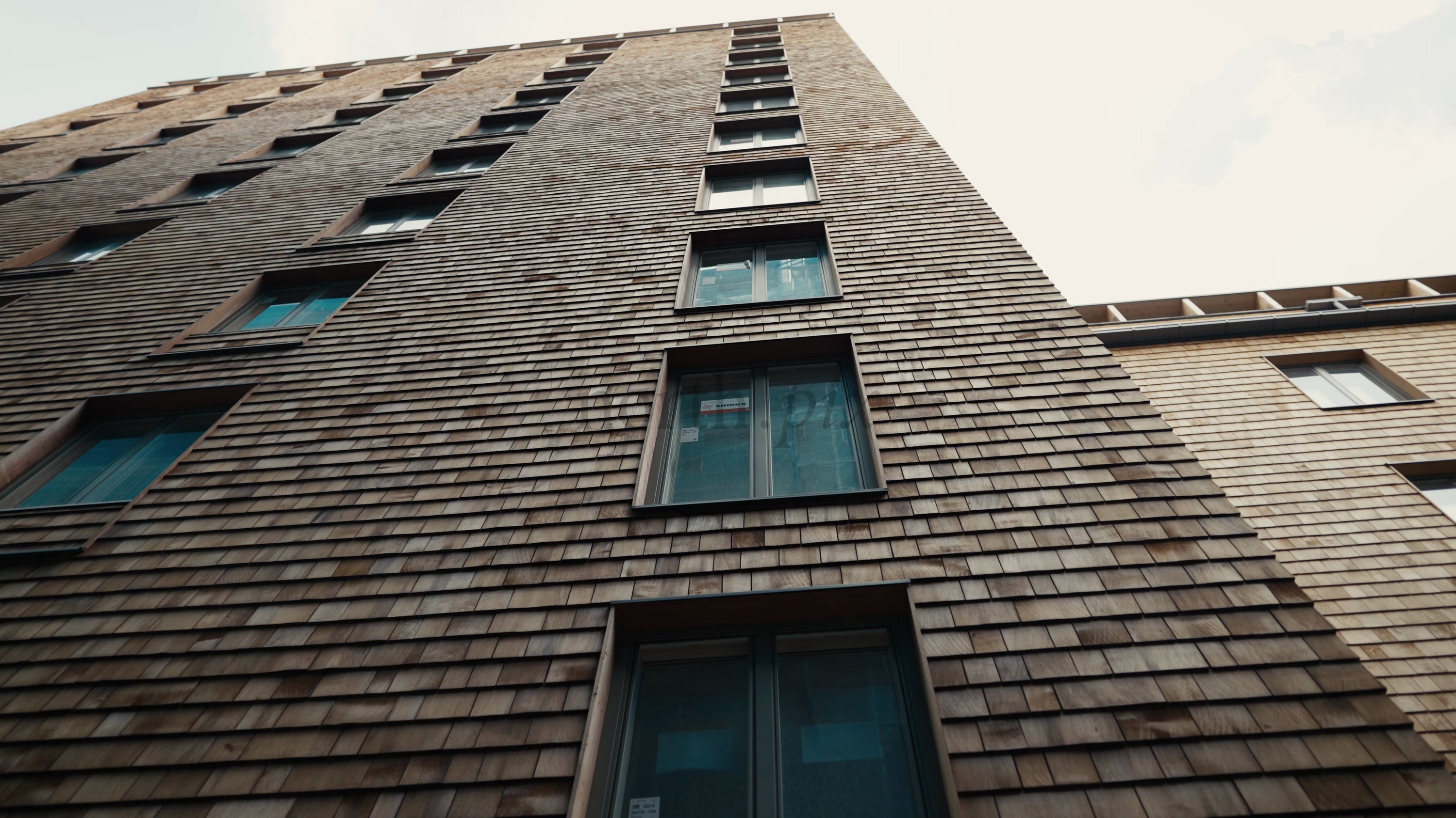 Modern architecture of a high-rise apartment building with wooden tile facade. The camera pans up. Urban real estate and sustainable living concepts.