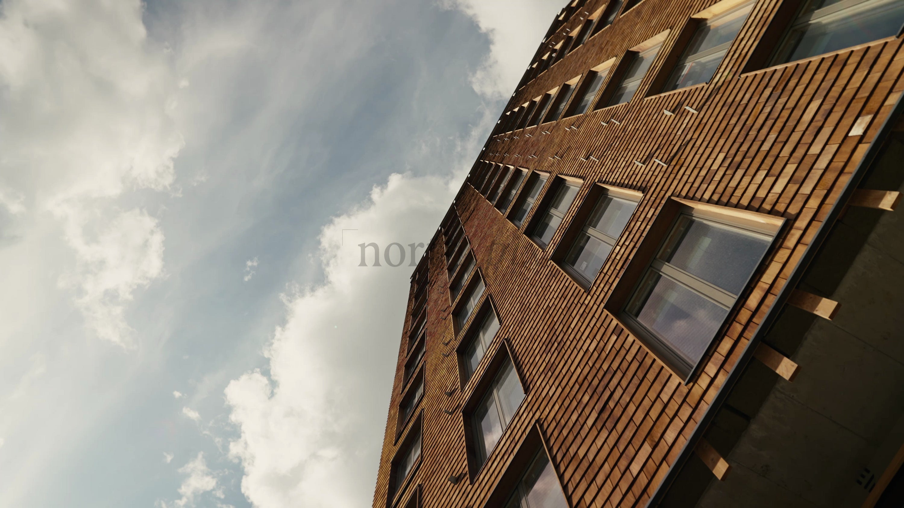 Low angle, sliding shot of a modern, multi-story, wooden, residential building, against a backdrop of a cloudy sky. The camera moves up and down to the right, giving viewers a unique view of wood architecture. Perfect for showcasing sustainable building materials and design.
