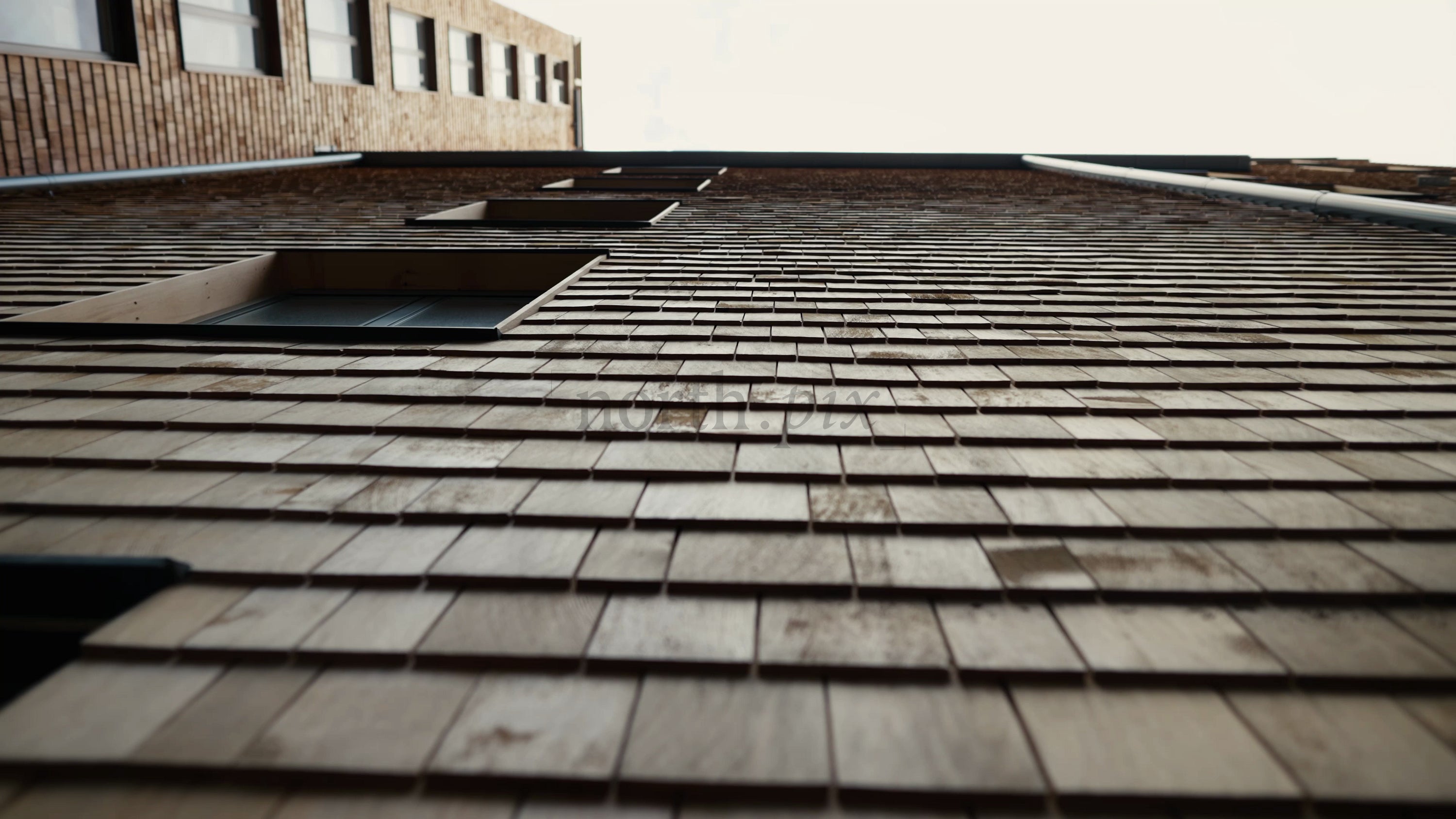 Low angle shot of a modern wood building's facade, showcasing architectural details. The camera slowly tilts upwards, revealing the natural textures and unique design elements of the wooden shingles and brick exterior.