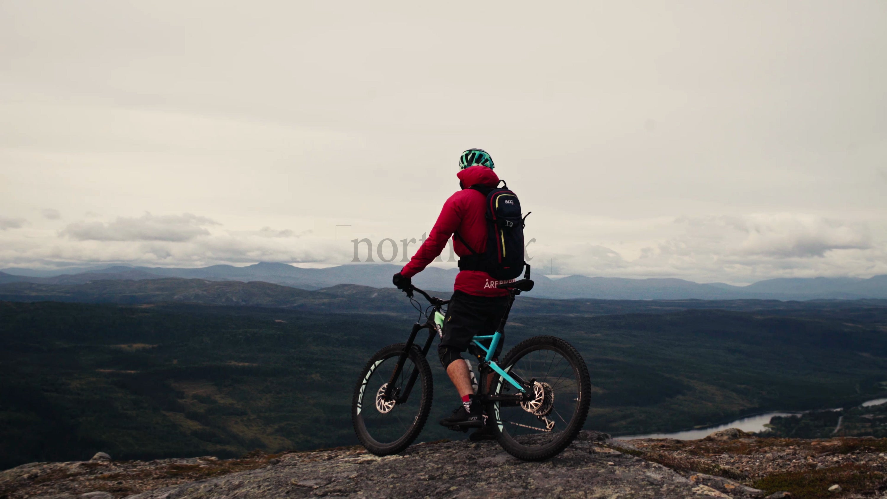 A mountain biker pauses at the summit before a downhill ride. Scenic view of a valley. Adventure and freedom in nature.