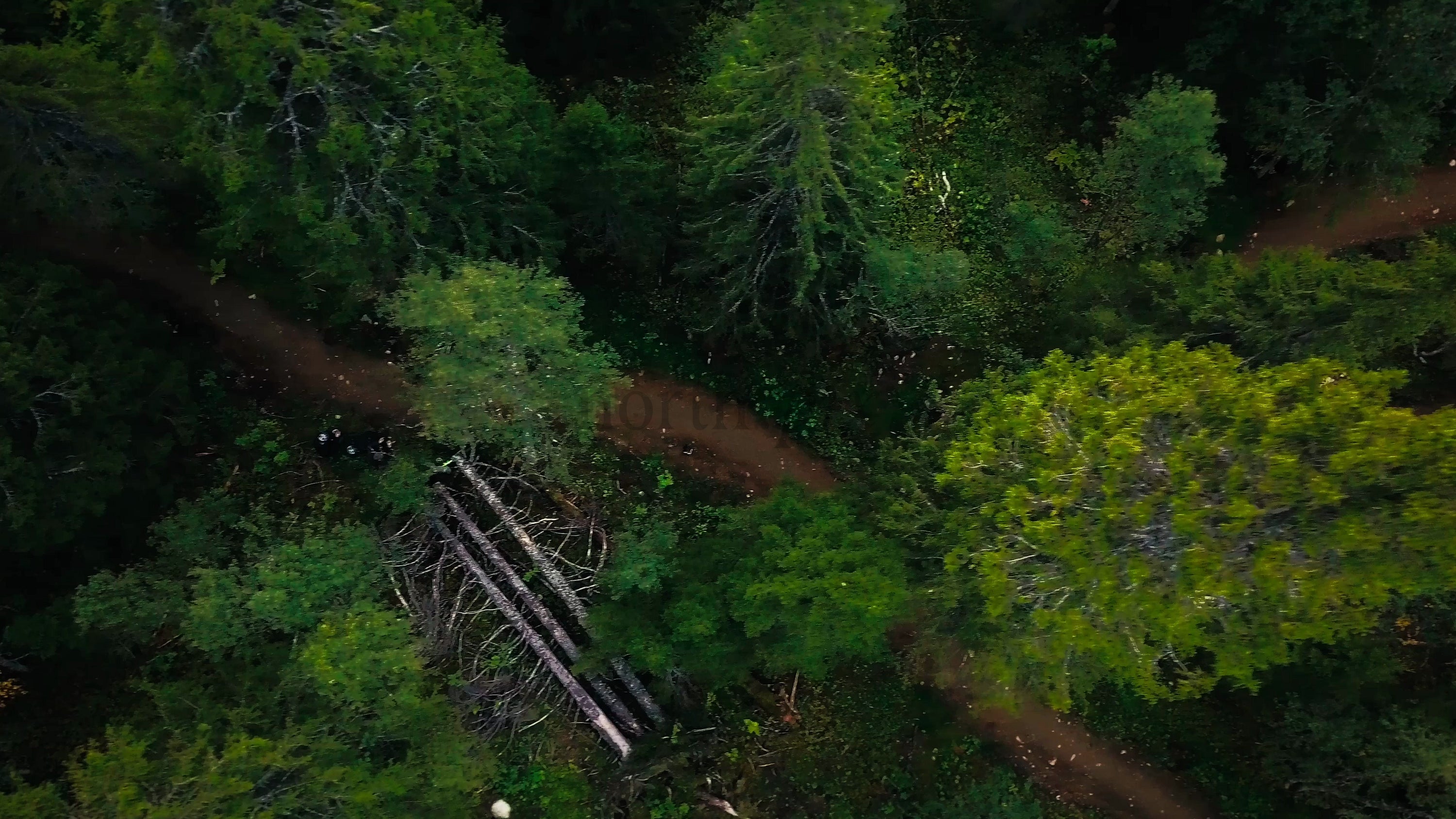 Aerial view of a mountain biker riding downhill on a winding dirt trail through a lush green forest. This video evokes a sense of adventure, freedom, and connection with nature.