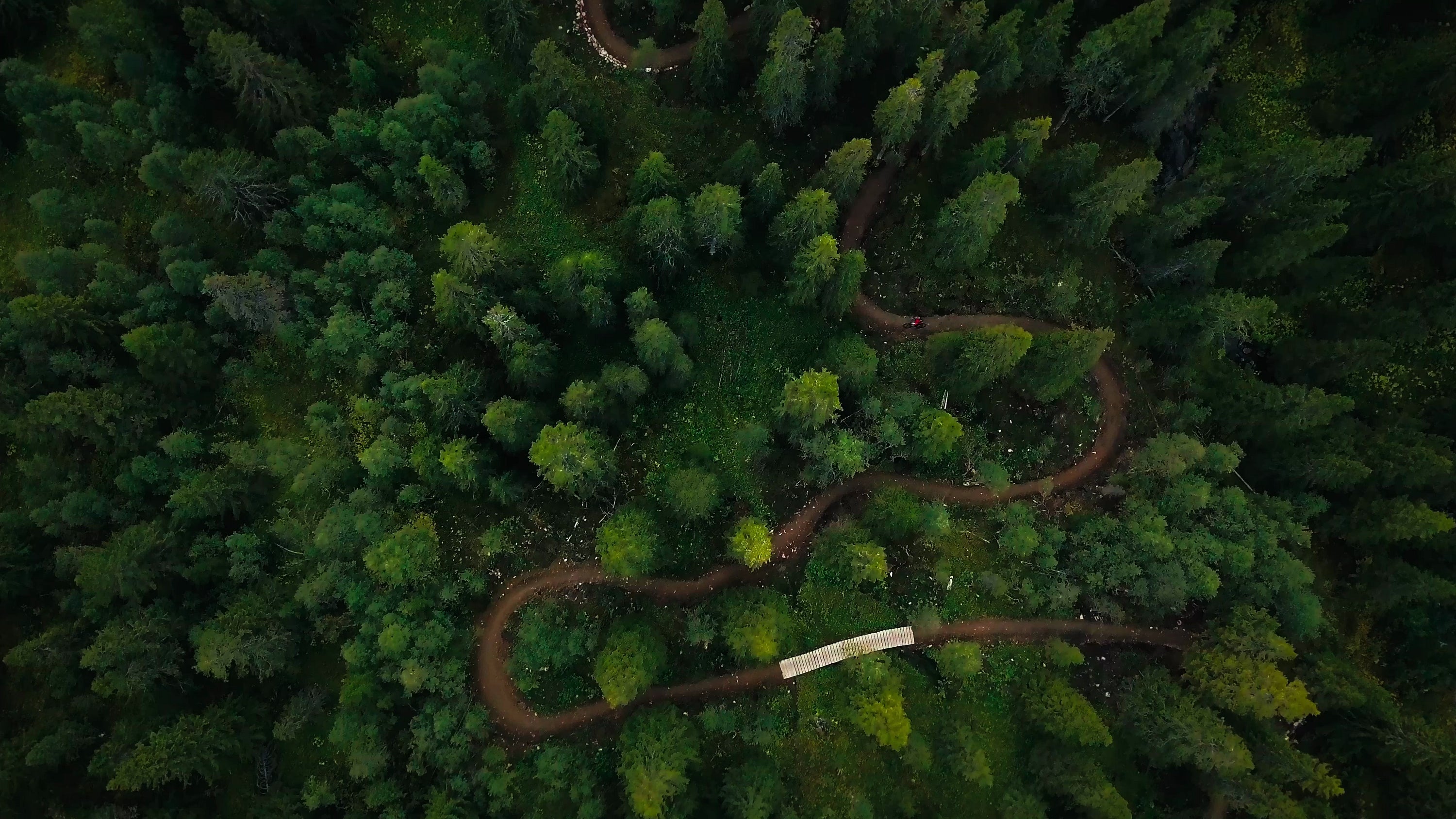 Aerial view of a mountain biker riding a winding downhill trail through a lush green forest.
