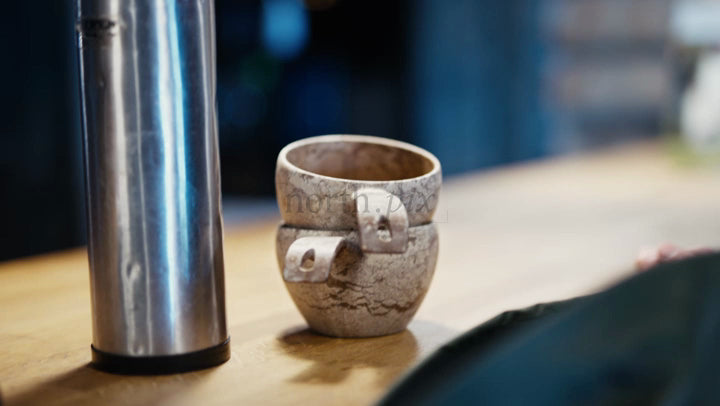 A person adjusts their backpack strap while sitting at a wooden table. Two kuksas and a thermos are visible on the table.
