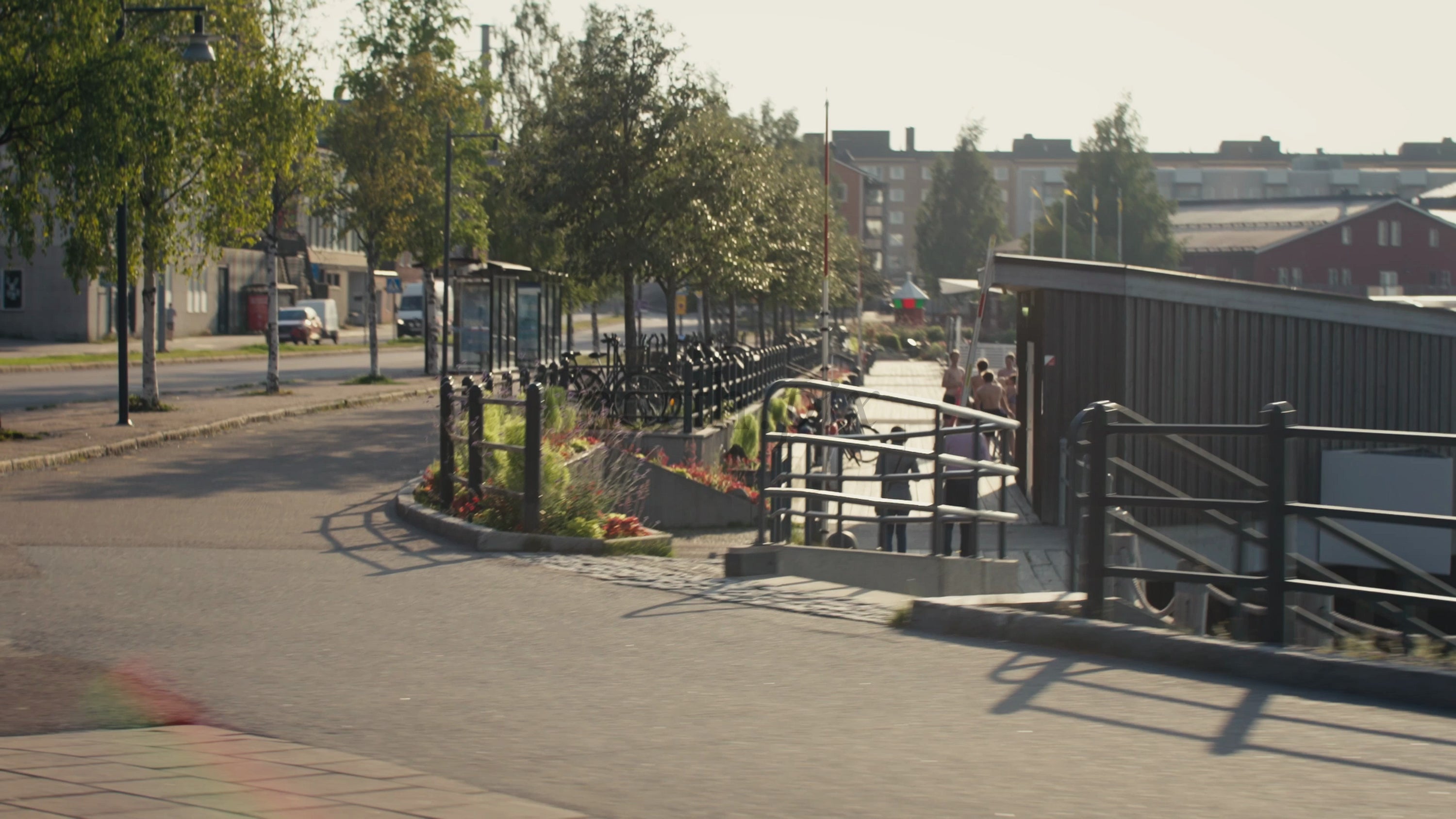 POV driving shot of Luleå city on a sunny summer day. Passing by pedestrians, bicycles and buildings in this Swedish urban center.