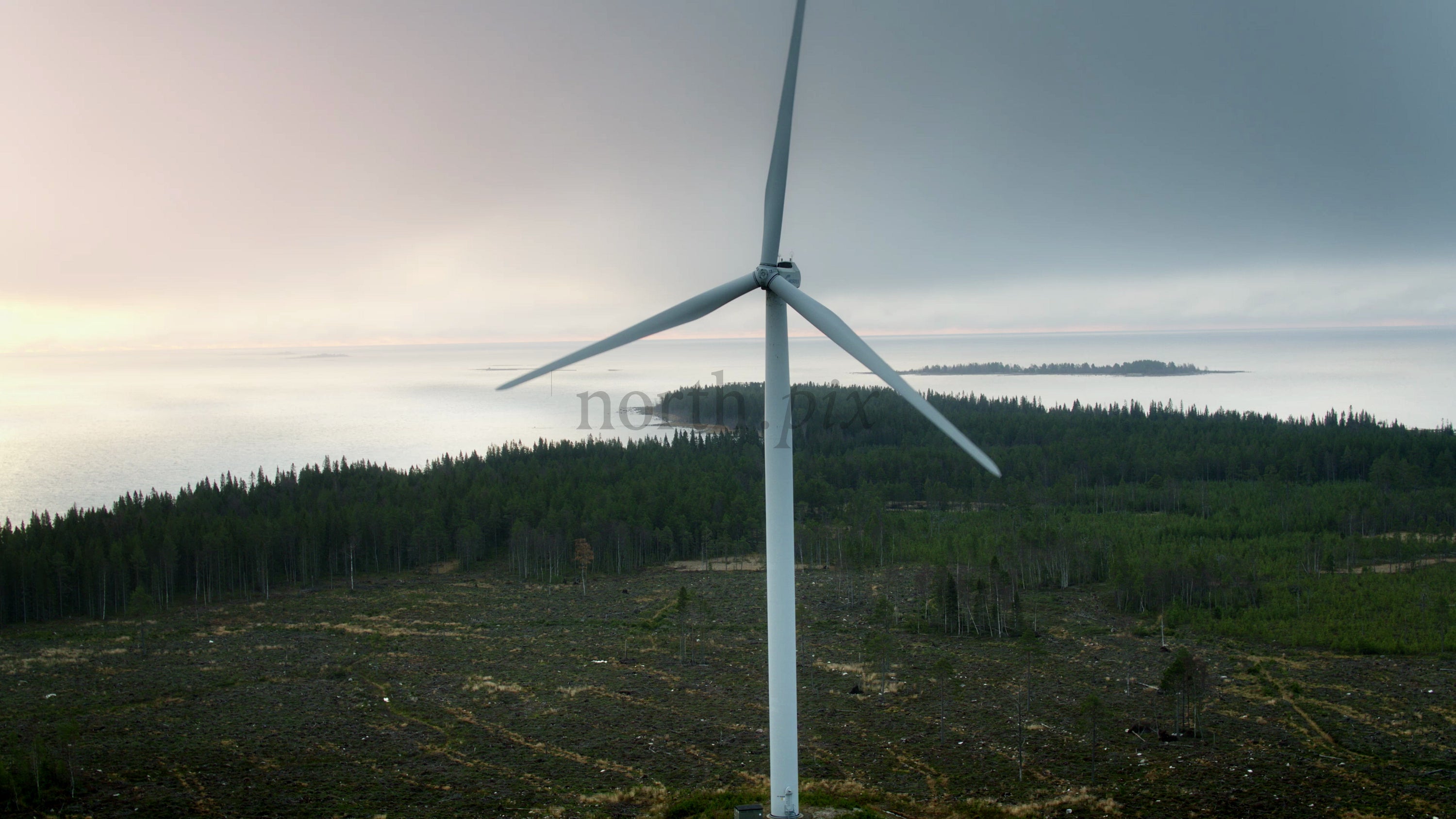 Wind turbine rotating, generating clean energy against a cloudy sky, coastal forest, and sunset backdrop. Aerial static shot showcasing sustainable power generation.