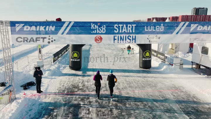 Runners Crossing Finish Line at Winter Race on Ice in Luleå, Sweden