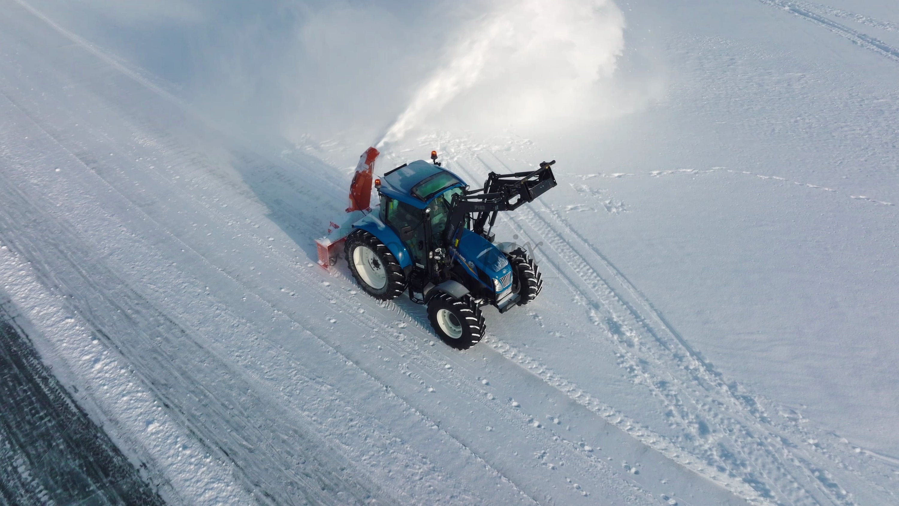 Aerial drone footage of a blue snowplow tractor clearing snow from an icy road in Luleå, Sweden. Winter road maintenance. Daytime.