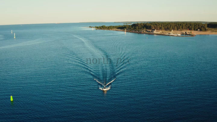 A motorboat navigates the serene waters of the Luleå archipelago on a bright summer day. The drone captures a wide shot of the boat's journey, with the coastal landscape and clear blue water.