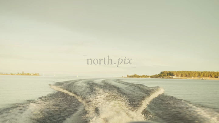 POV shot of a boat's wake as it travels through the Luleå Archipelago in Sweden during a bright summer day.