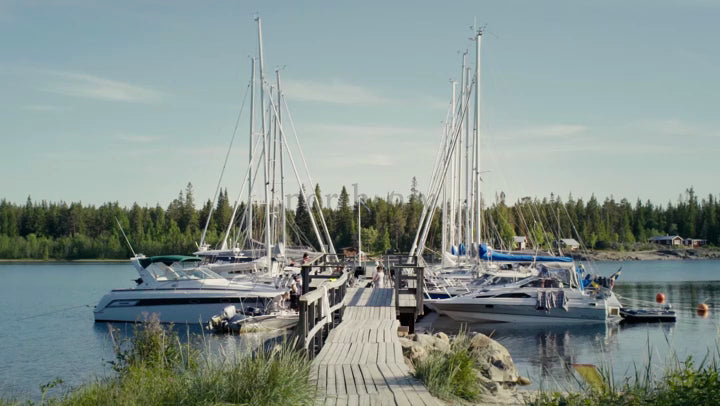 Sailboats and motorboats moored at a wooden dock in the Kluntarna Archipelago, Lulea, Sweden. Summer day with bright sunlight and a tranquil atmosphere.
