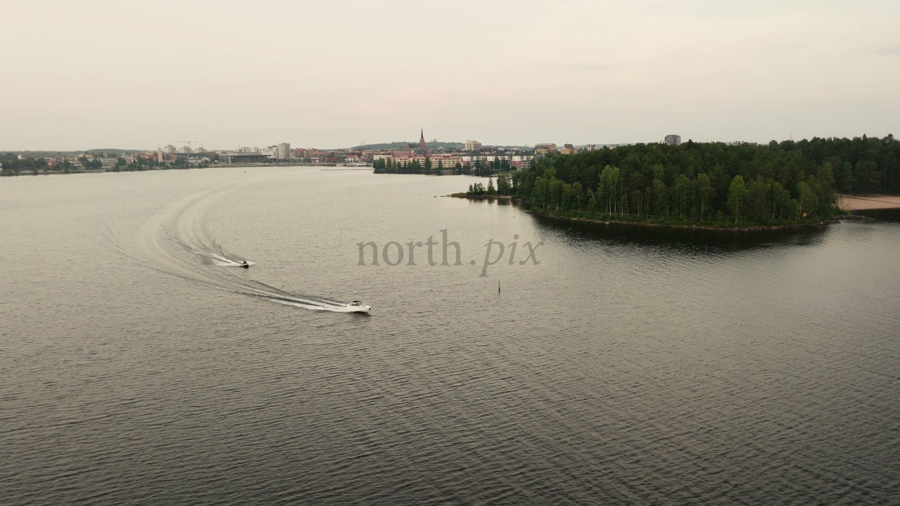 Aerial view of boats and a jet ski cruising through a bay near Luleå, Sweden, on a summer evening. Camera follows the boats.