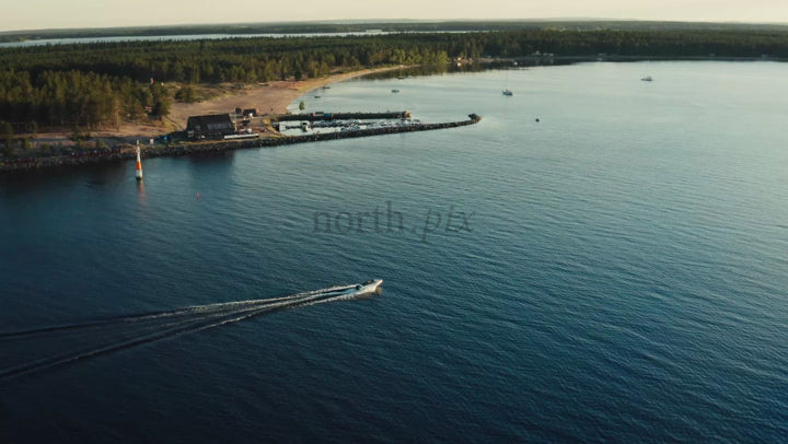 A motorboat navigates the calm waters of the Luleå archipelago during a serene summer evening. The drone captures a wide, overhead shot of the idyllic coastal landscape.