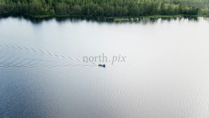 Aerial drone view of a motorboat on a calm lake near Luleå, Sweden, during a bright summer evening. The tranquil scene captures the essence of Nordic nature.