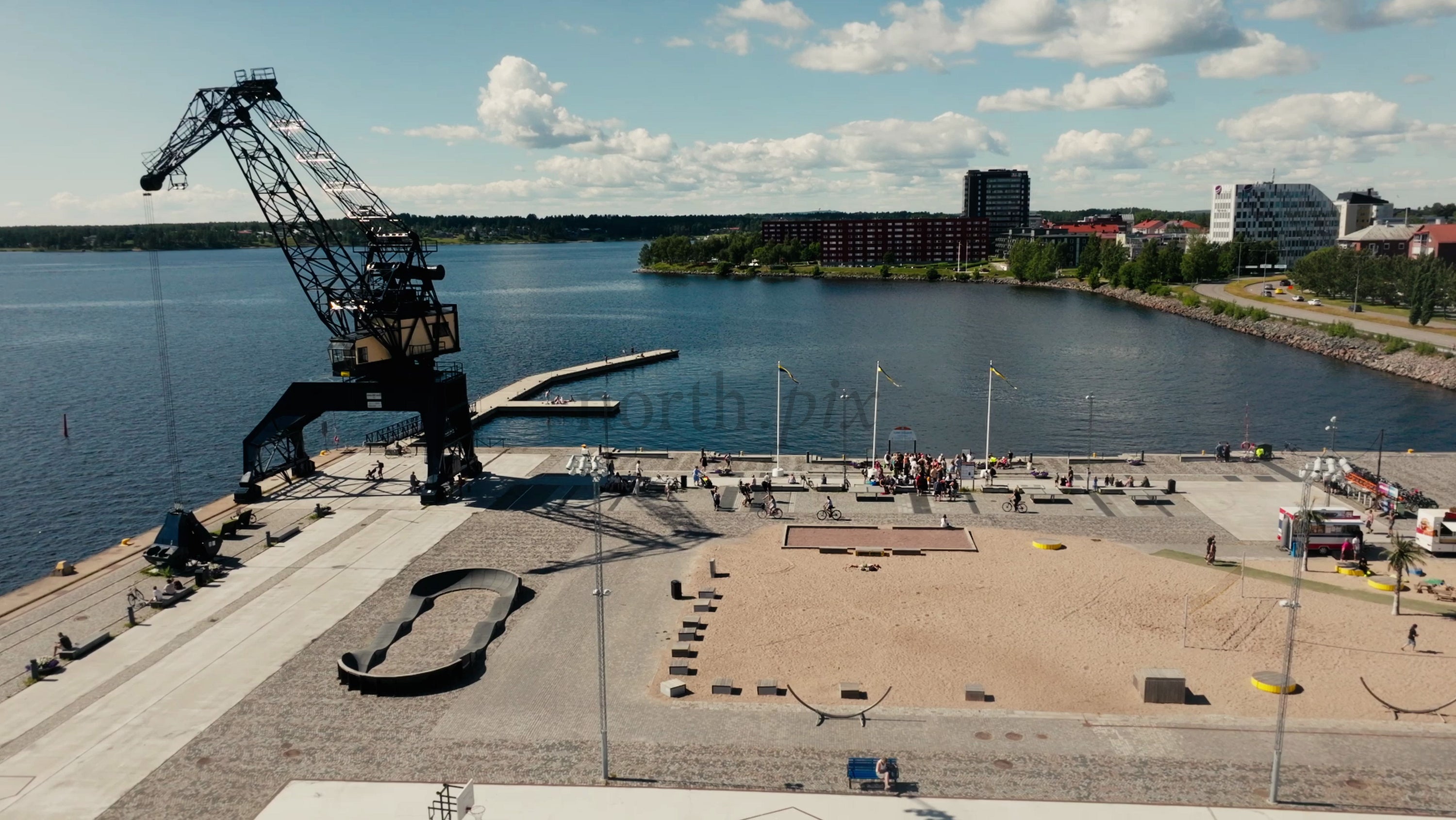 Aerial view of Luleå, Sweden, in summer. People enjoy the sunny day by the water. The camera pans across the cityscape, showcasing a large crane, harbor, buildings, and beach area.