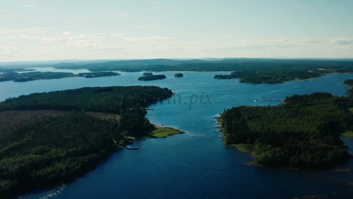 Aerial view of the Luleå archipelago in summer. The drone captures the stunning landscape of islands, water, and forest, showcasing the serene beauty of northern Sweden.