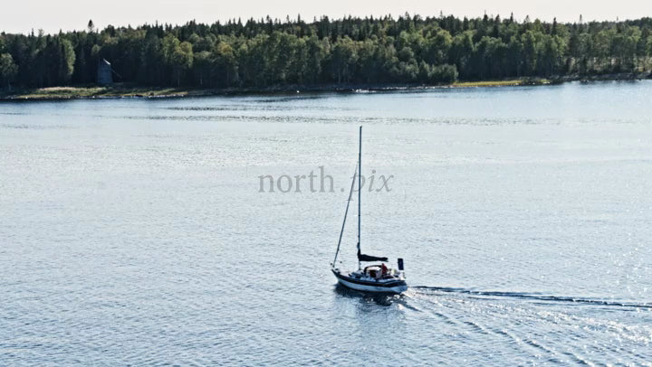 Sailboat navigating through the Junkön Archipelago in Luleå, Sweden, during a bright summer day. Drone footage captures the serene coastal landscape.